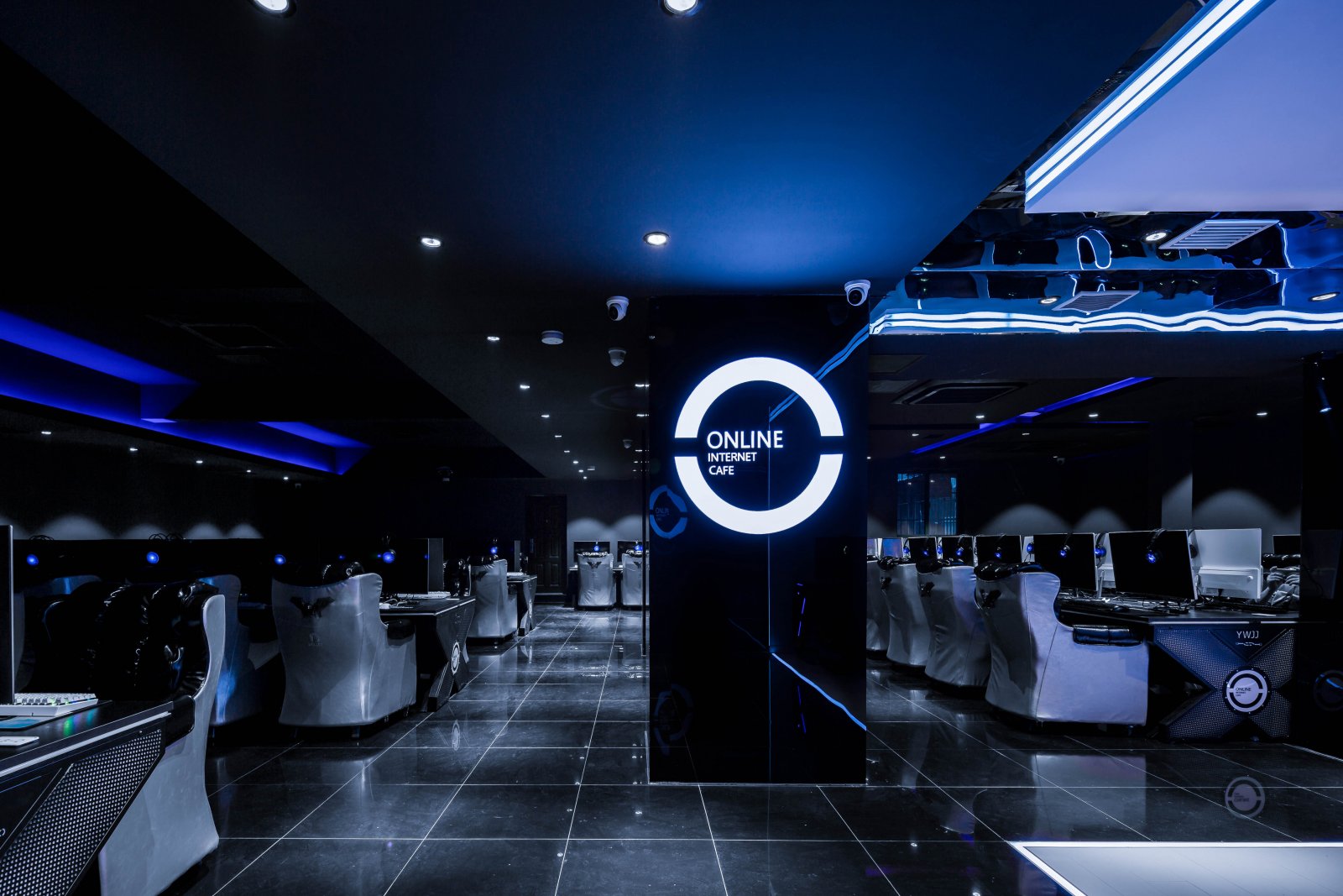 網(wǎng)(wǎng)吧裝修案例:電競(jìng)燈光網(wǎng)(wǎng)咖,設(shè)(shè)計(jì)裝修效果圖整體設(shè)(shè)計(jì)風(fēng)(fēng)格以酷炫的燈光為基礎(chǔ)(chǔ),在此空間中,明與暗,線(xiàn)與面,光與影,延伸與抵抗,全部以二元對(duì)立的方式吸收空間的敘事性,讓身體里的每一個(gè)細(xì)(xì)胞在其中激蕩。