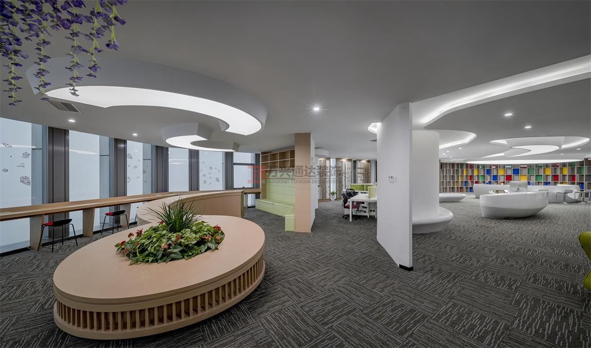 辦公室裝修公司案例:整體辦公空間設(shè)(shè)計(jì)中,大氣與細(xì)(xì)致并存,將設(shè)(shè)計(jì)與藝術(shù)(shù)結(jié)(jié)合。設(shè)(shè)計(jì)理念: 室內(nèi)(nèi)設(shè)(shè)計(jì)元素均交織凝聚于行云流水的曲線(xiàn)流動(dòng)空間,設(shè)(shè)計(jì)表現(xiàn)(xiàn)形式不受拘束,每個(gè)空間都有自己特殊的弧度,致力于搭建“創(chuàng)(chuàng)新+智能+生態(tài)(tài)”的辦公環(huán)(huán)境。